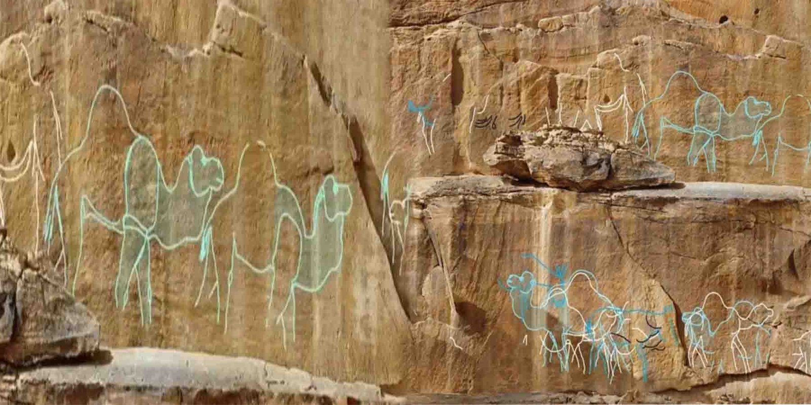 کچھ پتھروں پر اونٹوں کو قطاروں کی شکل میں دکھایا گیا ہے، جیسے وہ کسی قافلے کا حصہ ہوں۔