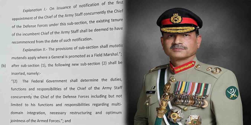 اس نئے قانون کے تحت آرمی چیف کو اب چیف آف ڈیفنس فورسز کا اضافی عہدہ دیا گیا ہے۔ یہ تاریخی ترمیم پاکستان کی دفاعی ساخت میں ایک بڑی تبدیلی سمجھی جا رہی ہے۔