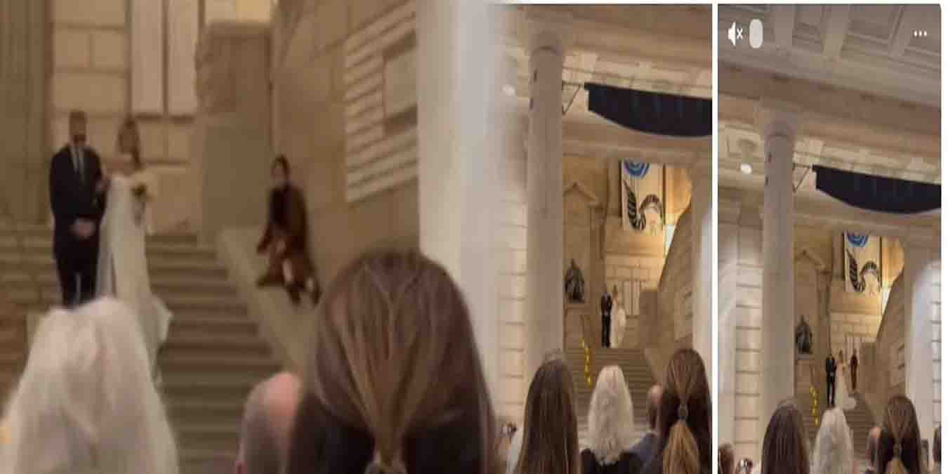 ویڈیو میں دیکھا جا سکتا ہے کہ دلہن اپنے والد کے ساتھ آہستہ آہستہ سیڑھیاں اتر رہی ہے، اور ہال میں موجود سب مہمانوں کی نظریں ان پر جمی ہوئی ہیں۔