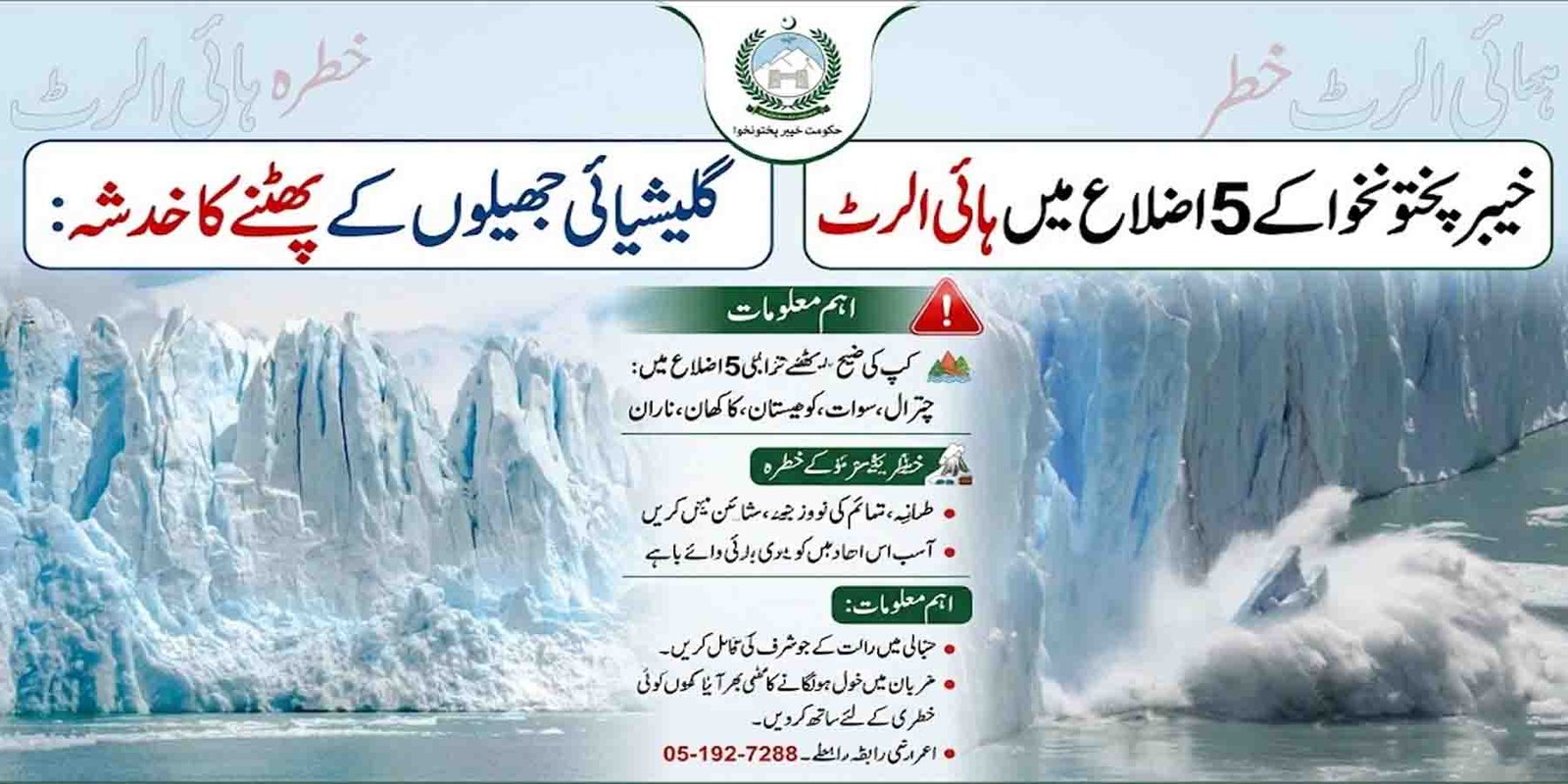 پشاور: خیبر پختونخوا کے بالائی اضلاع میں موسمی صورتحال کے پیش نظر گلیشیائی جھیلوں کے پھٹنے (GLOF) کا خدشہ بڑھ گیا ہے، جس کے باعث Provincial Disaster Management Authority نے متعلقہ پانچ حساس اضلاع میں ہائی الرٹ جاری کر دیا ہے۔ حکام کے مطابق یہ پیشگی اقدام ممکنہ قدرتی آفات سے نمٹنے اور انسانی جانوں و املاک کے تحفظ کو یقینی بنانے کے لیے اٹھایا گیا ہے۔