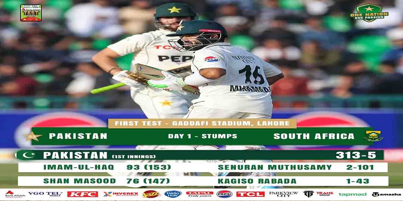 قذافی اسٹیڈیم، لاہور میں پاکستان اور جنوبی افریقا کے مابین جاری پہلے ٹیسٹ میچ کے پہلے دن کے کھیل کا اختتام پاکستان کے حق میں ہوا، جہاں قومی ٹیم نے 5 وکٹوں کے نقصان پر 313 رنز بنا لیے ہیں۔ دن کے اختتام پر محمد رضوان 62 اور آغا سلمان 52 رنز کے ساتھ ناٹ آؤٹ کریز پر موجود ہیں۔
