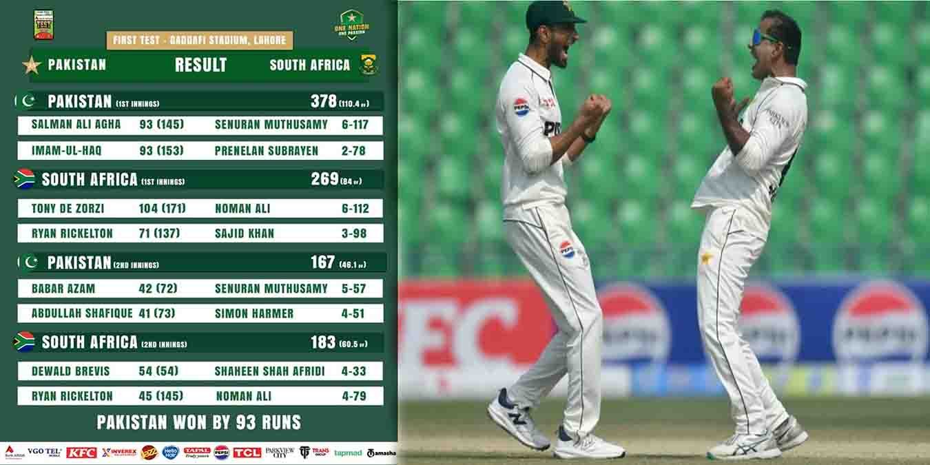 پاکستان کرکٹ ٹیم نے جنوبی افریقہ کے خلاف لاہور کے تاریخی قذافی اسٹیڈیم میں کھیلے گئے پہلے ٹیسٹ میچ میں شاندار کارکردگی کا مظاہرہ کرتے ہوئے 93 رنز سے فتح حاصل کی اور سیریز میں 1-0 کی برتری حاصل کر لی۔ اس جیت نے نہ صرف قومی ٹیم کے حوصلے بلند کیے بلکہ نوجوان کھلاڑیوں کی عمدہ کارکردگی نے مستقبل کے لیے اُمید کی کرن بھی روشن کر دی۔