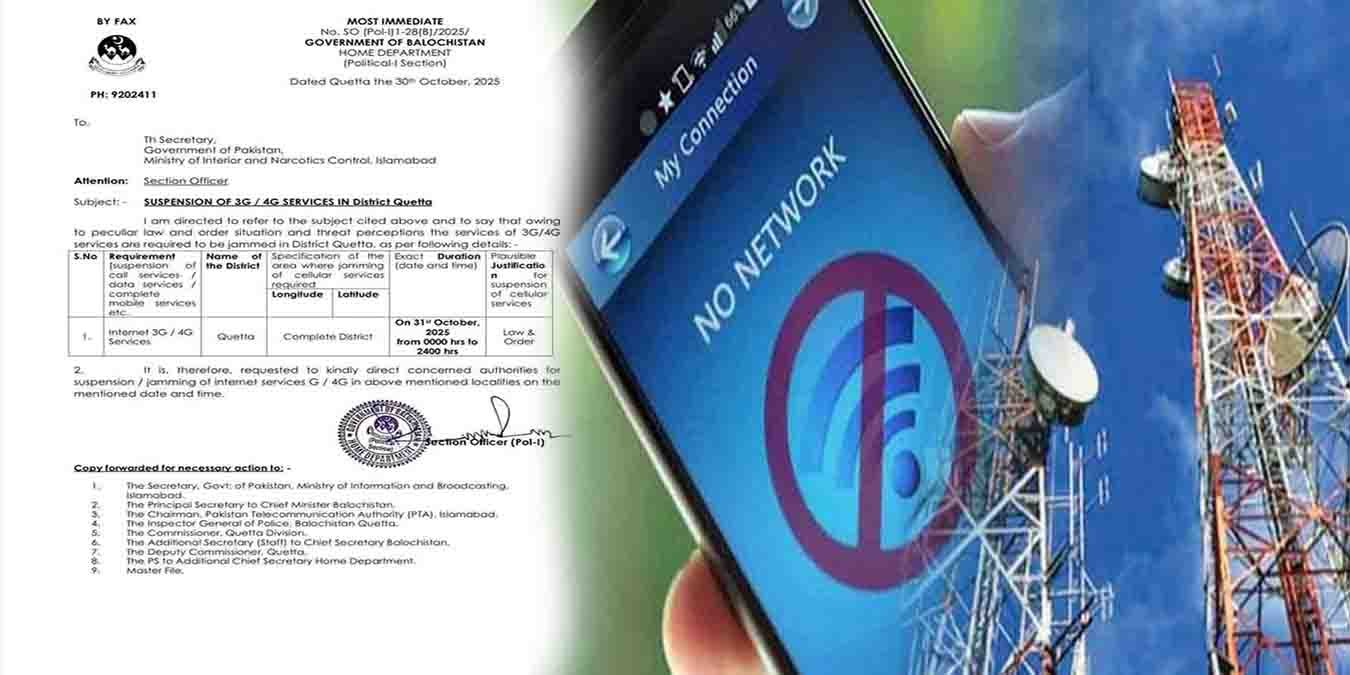 آج رات 12 بجے سے کوئٹہ میں حکومتی احکامات کے تحت موبائل انٹرنیٹ ڈیٹا سروس معطل کردی گئی ہے۔ یہ فیصلہ محکمہ داخلہ بلوچستان نے امن و امان کی خراب صورتِ حال کو مدِ نظر رکھتے ہوئے لیا ہے۔ اس معطلی کا اطلاق پورے شہر میں ہوگا اور اس کے نتیجے میں طلبا، کاروباری حضرات اور آن لائن خدمات سے وابستہ افراد کو خاص مشکلات کا سامنا کرنا پڑے گا۔